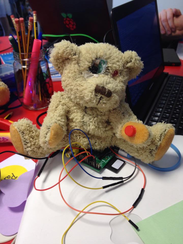 On my training course I was shown how to use the Pi to create working traffic lights that plugged into GPIO pins (more on that later), how to type in lines of code to ‘cheat’ in Minecraft, how to plug in a camera and type in lines of code to make it take a photo and how to code music in Sonic Pi – the upshot of all of this was that, with some of the other teachers on my course, we made a bear which took photos from the click of a button on it’s paw.