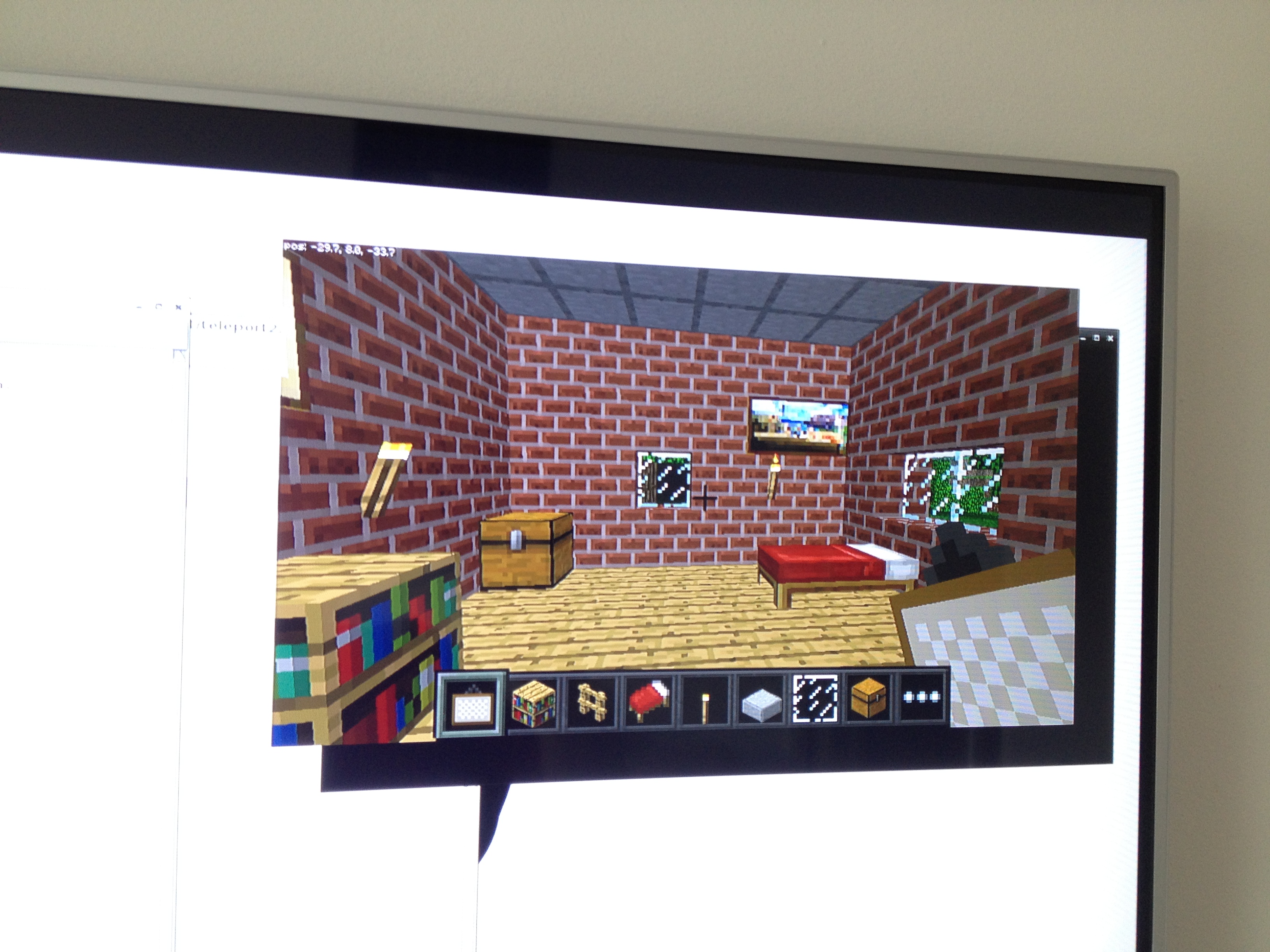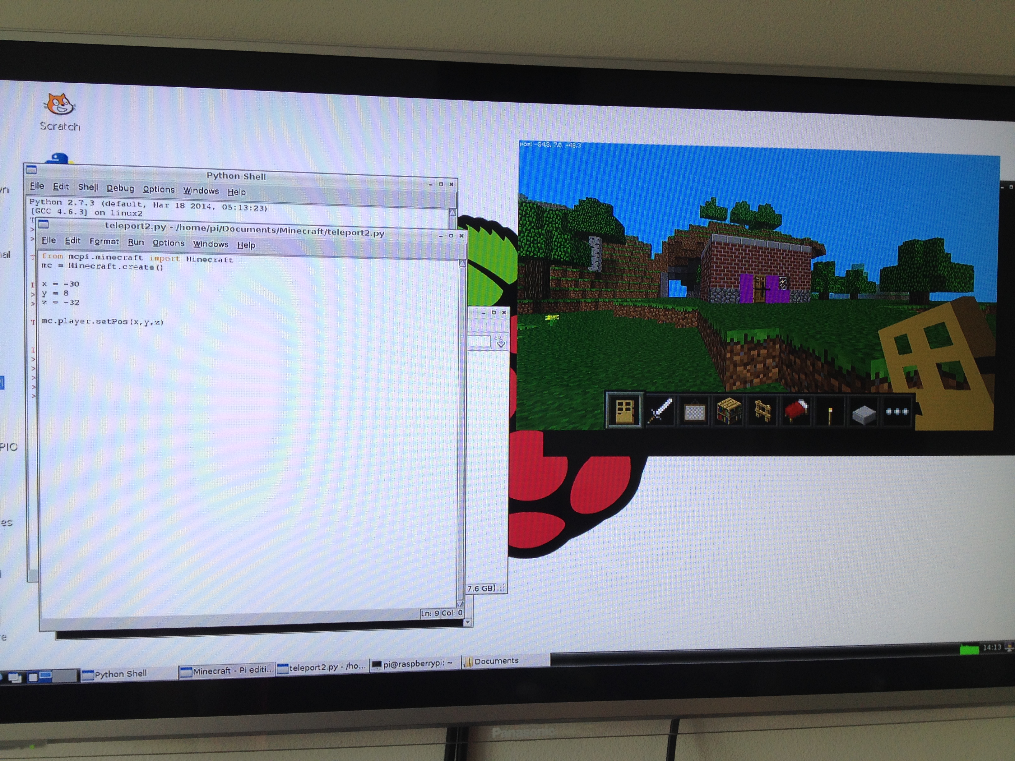 In order to teleport into my house I need to make a note of the co ordinates of it – in the top left hand corner, in white, are the xyz co ordinates of my front door (which need to be rounded to the nearest whole number for the code to work). I actually want to teleport to the middle of the room so I’m going to use -30, 8 and -32 in IDLE an then save my code.