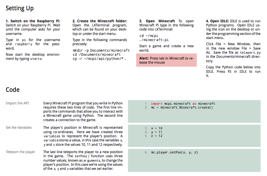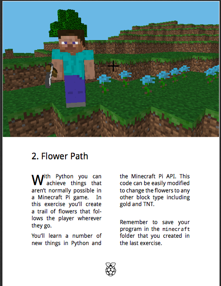 As with the CamJam sheets I looked at last week, I’m really impressed with the amount of detail in these workbooks – not only are the lines of code explained, there is some information on the back about what you’ve learned in terms of the language of code and an extension task. The first booklet explains everything from switching the Pi on to getting your code running and has a helpful big red box to remind you about using tab to release the mouse. From there you move on to making flowers follow your character, then building a house in one go, using chat, freezing water and making a ‘block fighter’ mini game.