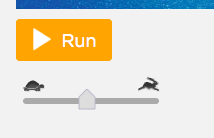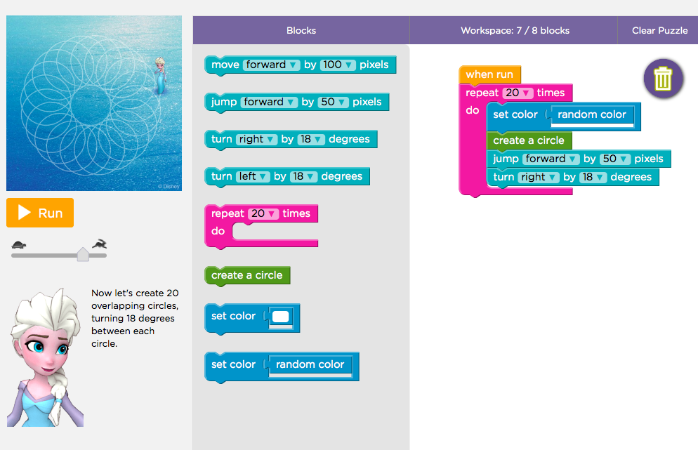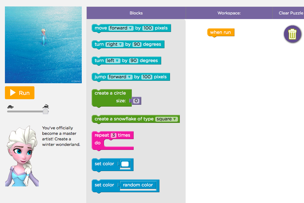 couple of other nice features as you work through – firstly, when you run your code your animated Elsa walks through what you’ve asked her to do, flinging snowflakes as she goes and this can be quite irritating after a while, so you can speed up the code using the hare and tortoise icon below the ‘run’ button.