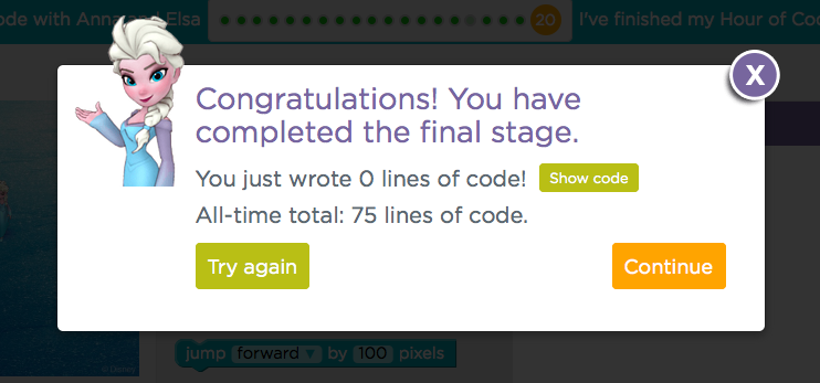 So, some conclusions – the Frozen activity at Code.org is a fantastic way to get kids interested in coding, especially girls. It gets tricky, but it’s not impossible with a little patience, especially as all of the tools are there and the drop down menus don’t give you too many options – even with trial and error you’d get it right in the end. I also liked that it gets adults more enthusiastic about code too – I showed this too my Year 3 teacher, who previously just didn’t get the point of coding and we ended up with several members of staff around the table getting invovled and asking questions – including “how is this coding?” which of course meant I had the opportunity to jump in and explain that block based coding teaches algorithmic thinking and just basically doing things in order. Year 3 are going to try this out next term because she enjoyed herself so much, although I am concerned that some of the angle work later on might be a bit too tough for them…