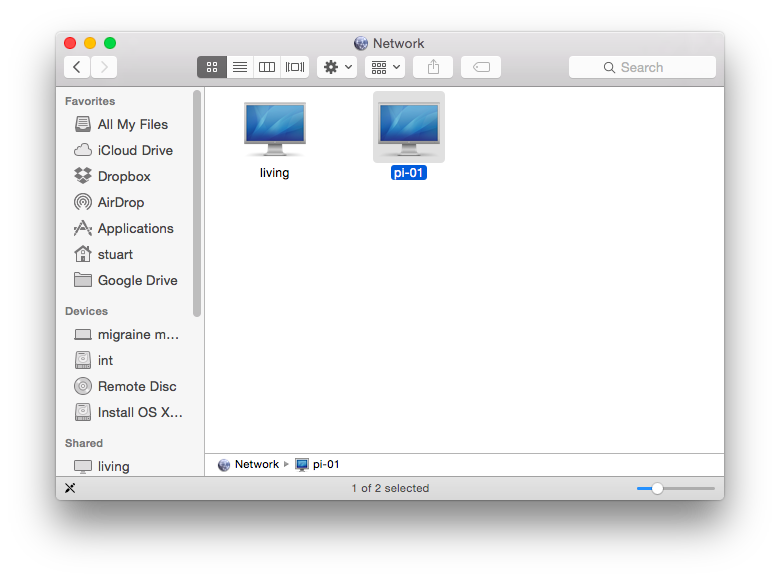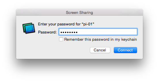 and then go back to the Finder/Click on the desktop on your Mac. From the ‘Go’ menu choose ‘Network’ which should display a window that contains all Macs & PCs on your network that are offering some kind of sharing service (file sharing, VNC/Screen Sharing etc). Hopefully after your Pi has rebooted you will see it listed in there! All that’s now left to do is double click on it and then from the upper right corner of the window choose ‘Share Screen’. The Mac’s Screen Sharing application should launch and prompt you for a password. This will be the password you set earlier using the x11vnc -storepasswd command. Once you type it in and click connect/press return you should hopefully see your Raspberry Pi’s desktop and be able to use it just like you would had you a proper monitor, keyboard & mouse connected directly to the Pi.