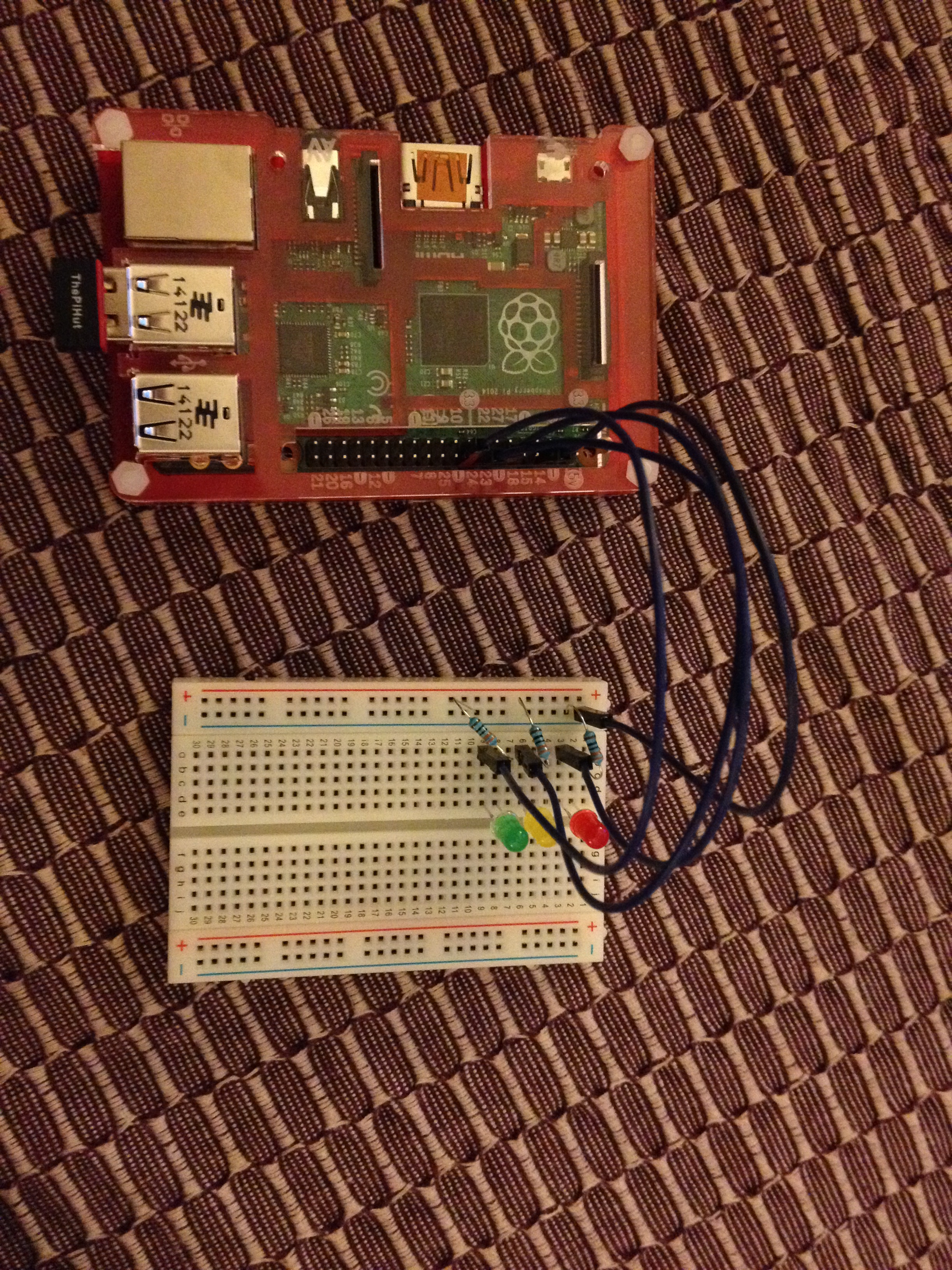 So, the first thing I needed to do was turn off the pi and build my circuit – the worksheet doesn’t guide you through shutting down, but luckily I knew to type ‘sudo halt’ into my LXTerminal window. I’m not going to lie, this was the first time I’ve used a bread board properly and I felt a massive sense of achievement once I’d slotted in all the bits. I originally had problems getting things to stay in place until my other half pointed out that I needed to really push the resistors into place and not just slot them in loosely.