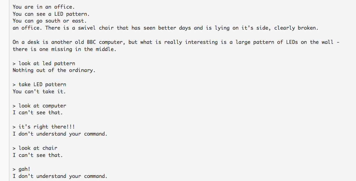 One thing this highlighted to me was the importance of creating an object and a description for every single noun in the room. My room description mentioned a computer, but I hadn’t created an object called computer and this led to my friend getting very, very frustrated.