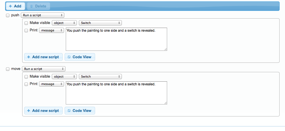 I also found that it was important to add extra verbs to word – in one room I wanted to have a picture which you could push to one side to reveal a switch, I discovered two things: Firstly, you need to drop a REALLY big hint in the description that the object can be moved and secondly, that you need to think about the different verbs that people might think of to describe pushing or moving or shoving a picture out of the way. I decided to make the object a container AND edit the verb field like so: