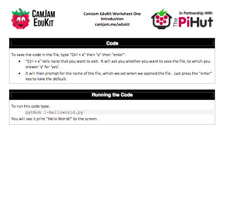 So, the first of the CamJam sheets is a very simple ‘setup and go’ activity – the traditional first thing to do with code is get the computer to print back “Hello World!” and so, of course, this is the first thing that the CamJam sheet has us do.